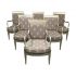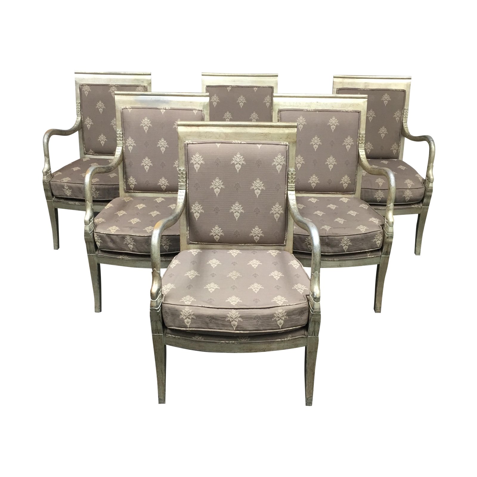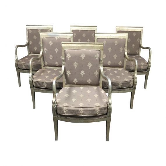 Design Plus Gallery presents a set of six chairs. Crafted of solid woods with carvings. The arms have a swan head motif. The seat and back are upholstered in a grey and silver repeat pattern fabric. The seat cushions are foam based and removable. Visible wear on fabric and arms. Arm Height: 26.5 inches, Seat Height: 17 inches.
