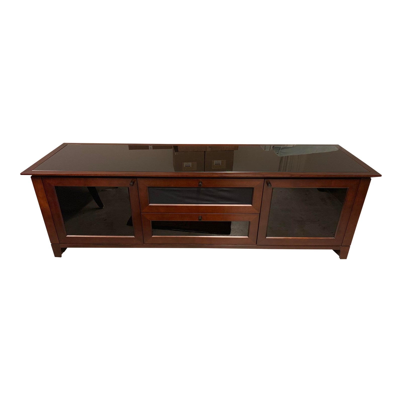 Design Plus Gallery presents a classic media cabinet from BDi Furniture. Rich stained hardwood veneers frame remote-friendly glass doors that are detailed with antique bronze pulls. The top expanse is protected with black glass. There are rear access panels with flow-through ventilations and cable management.