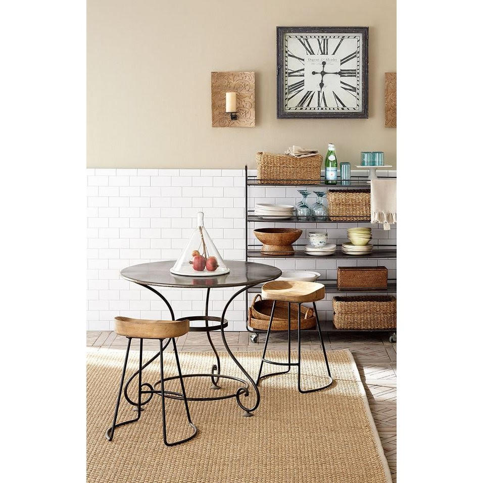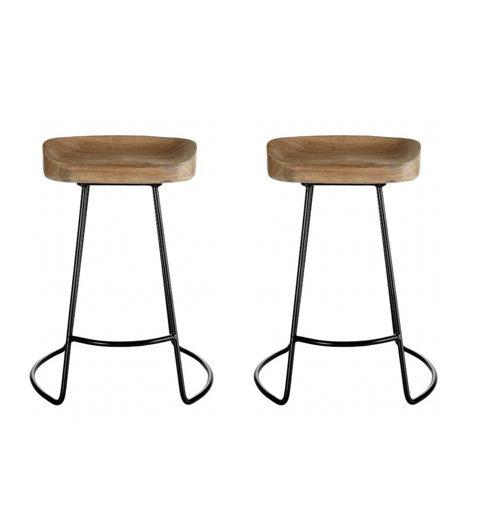 Design Plus Gallery presents a pair of counter stools by Wisteria. Modernism meets functionalism. The seats are unfinished solid oak wood with a slight bucket carved in for comfort. The metal frame base flares out at the bottom into a sturdy wide base and a slim but equally sturdy footrest joins the frame in front. Seat Height is 23.5 inches.