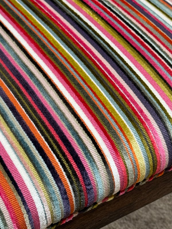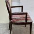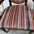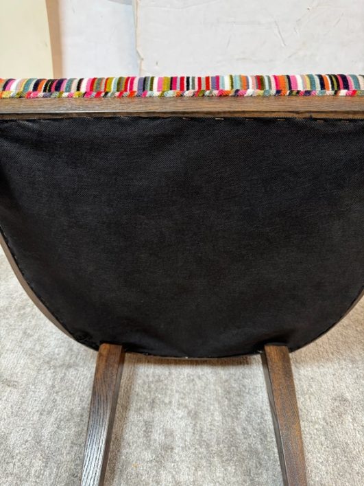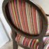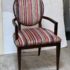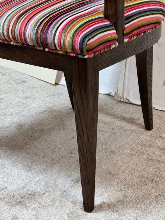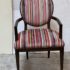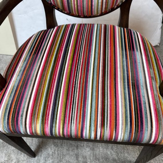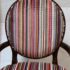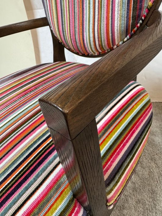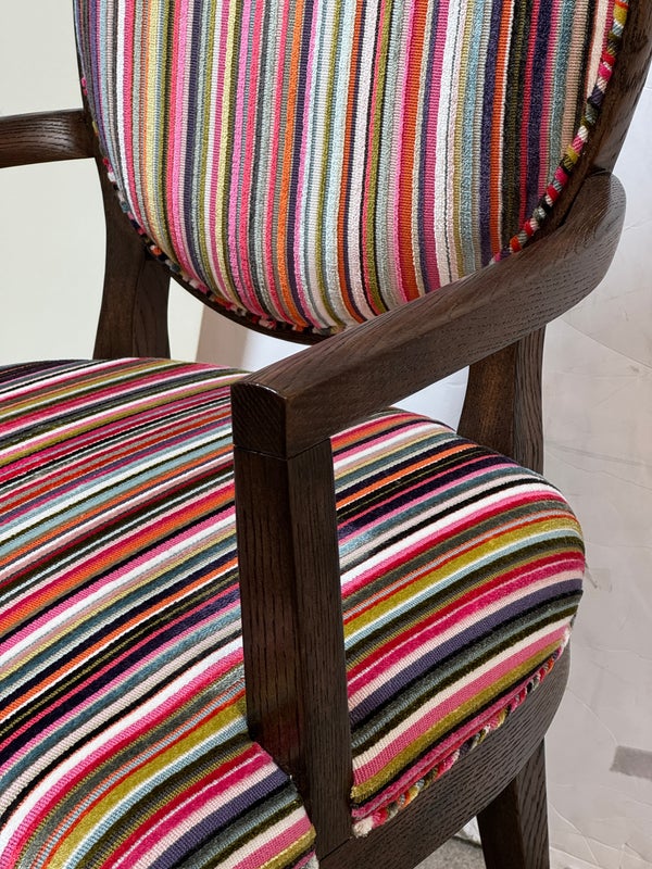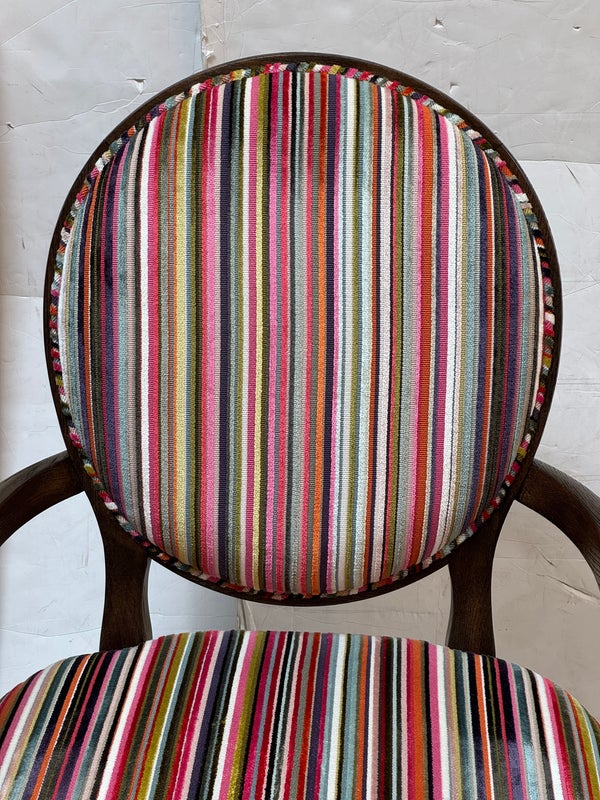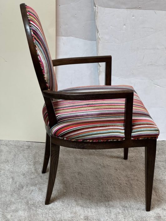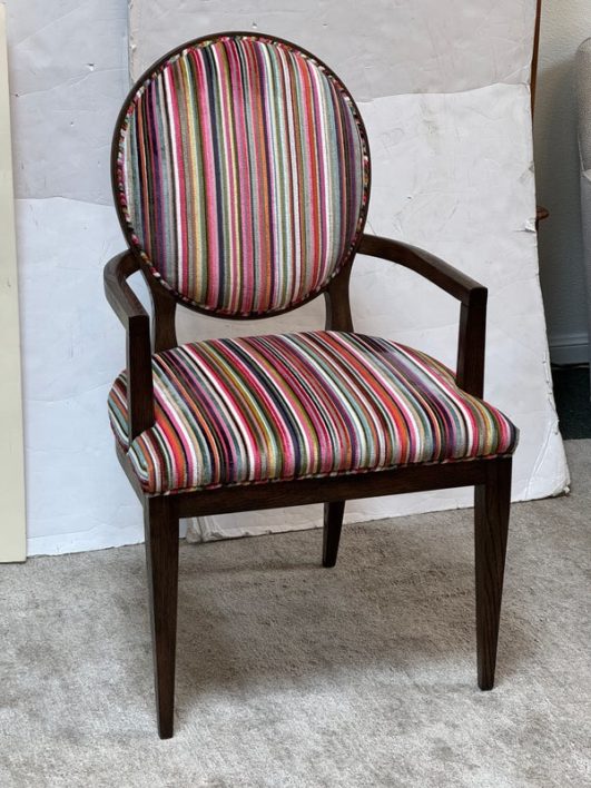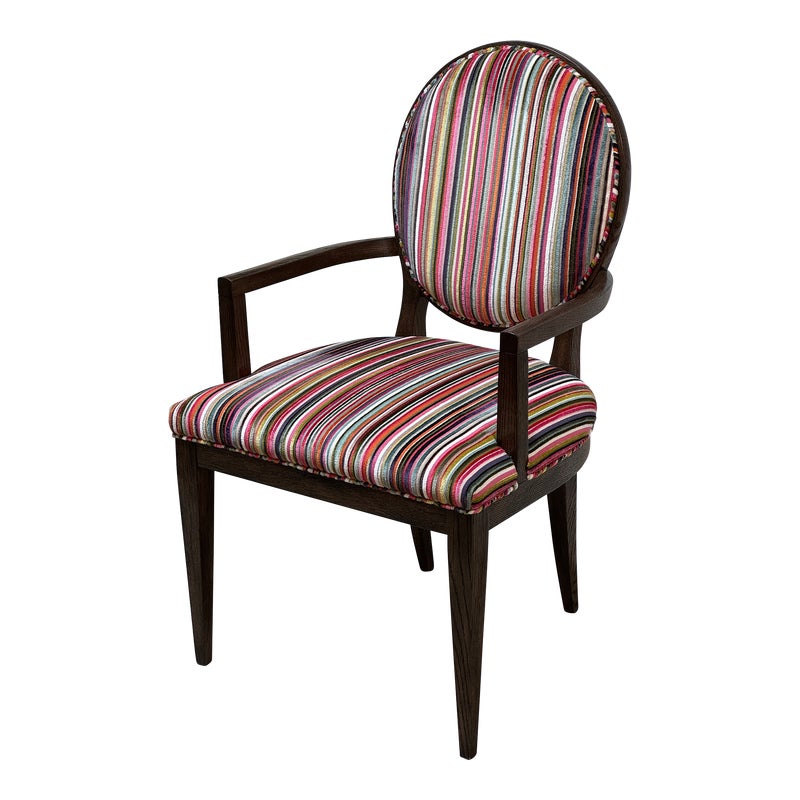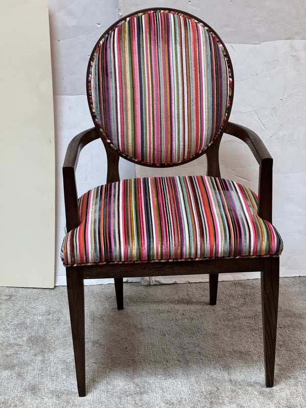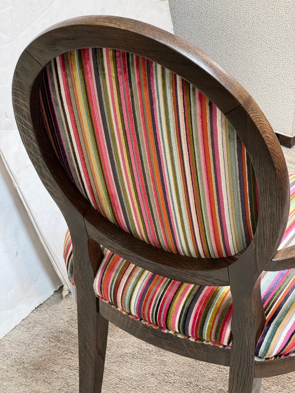 Design Plus Gallery presents a Ovale Chair, Marseille Collection by Woodbridge Furniture. This elegant oval back chair references late 18th century French originals. The Pindler striped custom upholstered seat is raised on tapering legs, and framed in tobacco finished oak. Little wear; condition is good for age and use.
