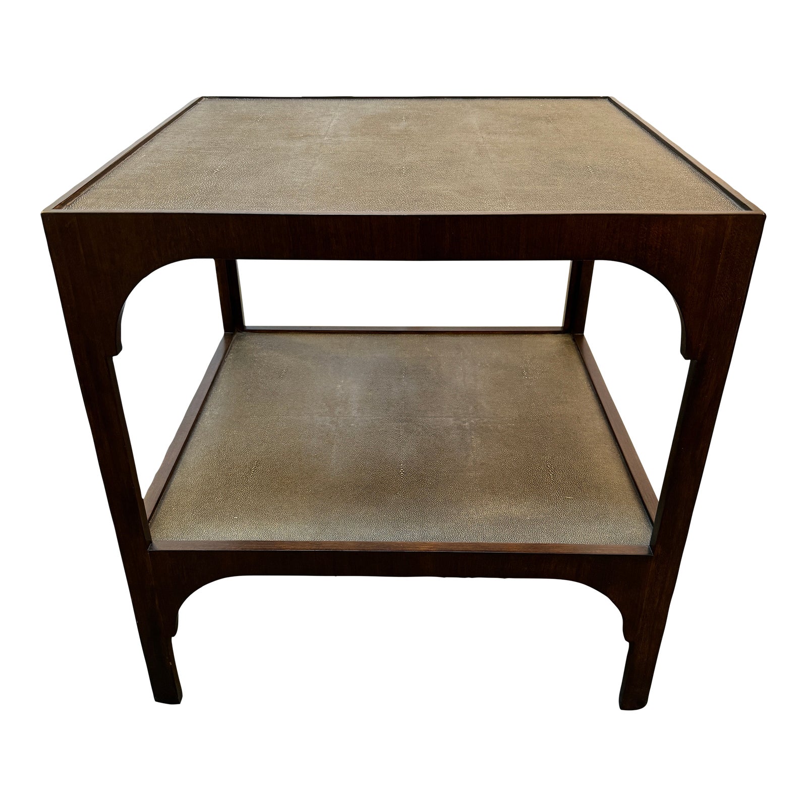 Design Plus Gallery presents the Savoye Lamp Table by Woodbridge, No. 1258. Beautiful dark-stained frame has corner defining aprons and squared legs. Each shelf is inset with two panels of faux shagreen. Light surface wear as shown; condition is consistent with age and use.