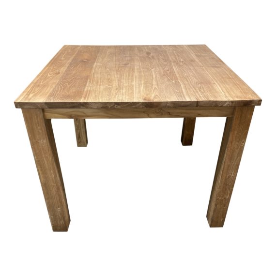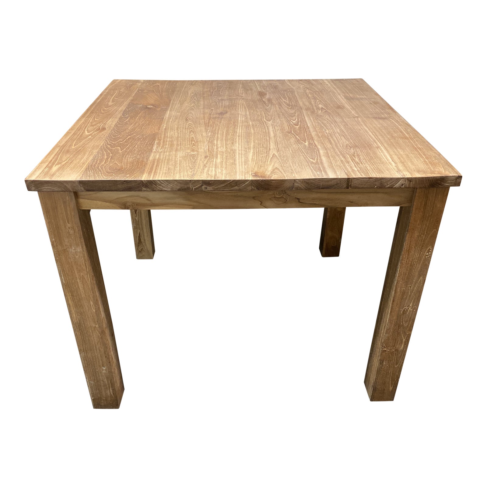 Design Plus Gallery presents a Wooden Duck Outdoor Teak Dining Table. Substantial parson style solid legs anchor the square table. All pieces made from the same washed tone of teak for a rustic + modern farm house vibe. There is visible wear from outdoor use and slight warping with the solid wood. Frame is reinforced with solid teak beams and minor apron clearance around all sides from the base. Coordinating Wooden Duck pieces might be available. Originally purchased from the Wooden Duck in Berkeley.
