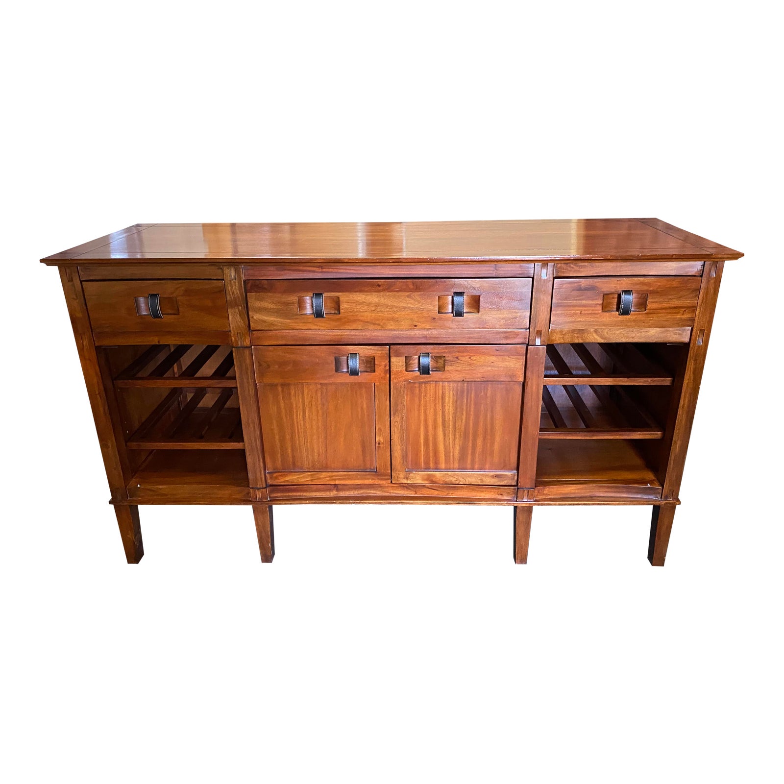 Design Plus Gallery presents a Scandinavian Designs Wooden + Leather Sideboard With Drawers + Wine Rack. Richly stained wood has a Chestnut tone and brings out the details in the moldings and joinery. A fusion of Mission + Scandinavian styles. Visible wear on the frame especially near the open base. Comes with adjustable shelving on the interior and unique black leather pulls. Open sides have slots for wind bottles and drawers on top help conceal storage.