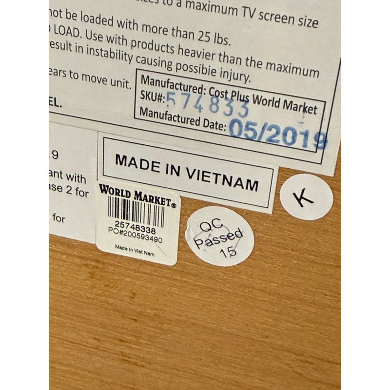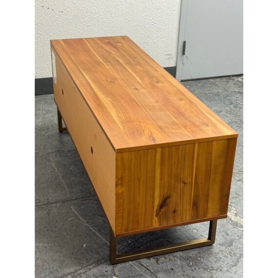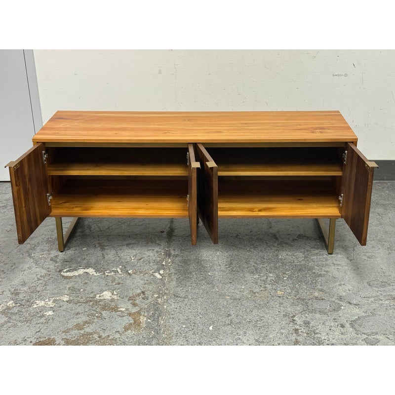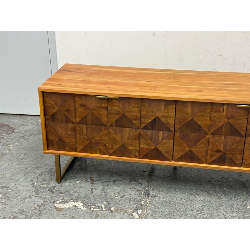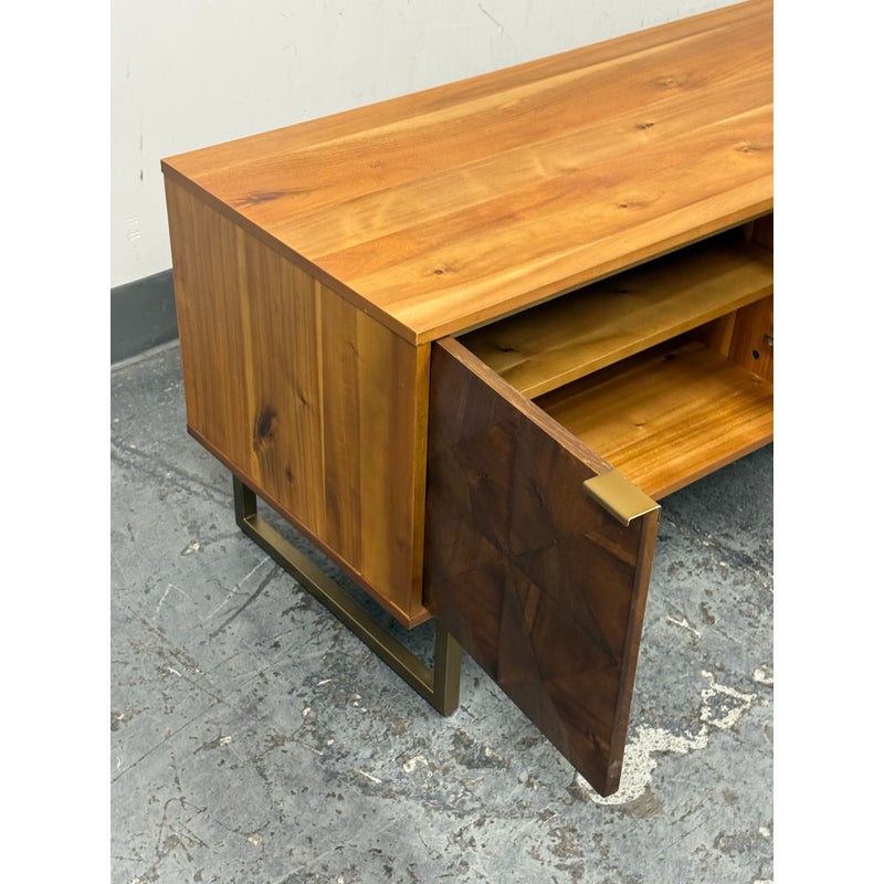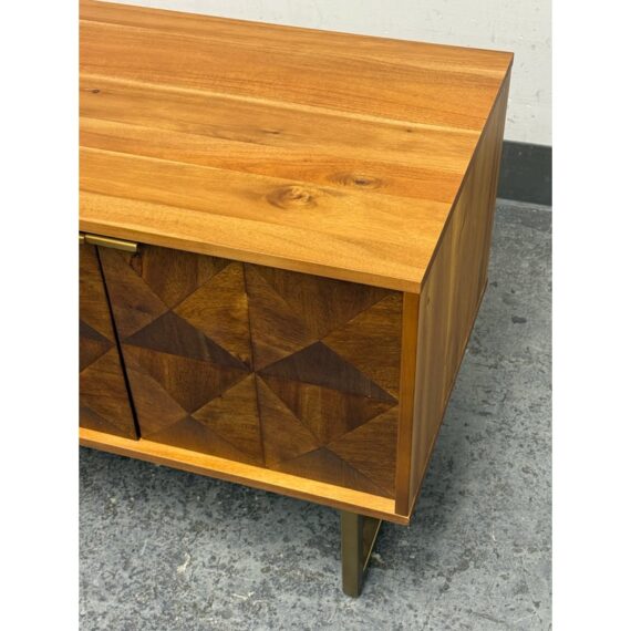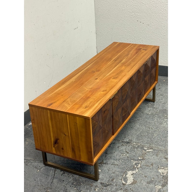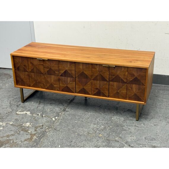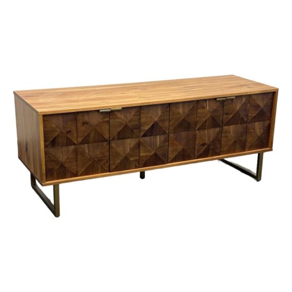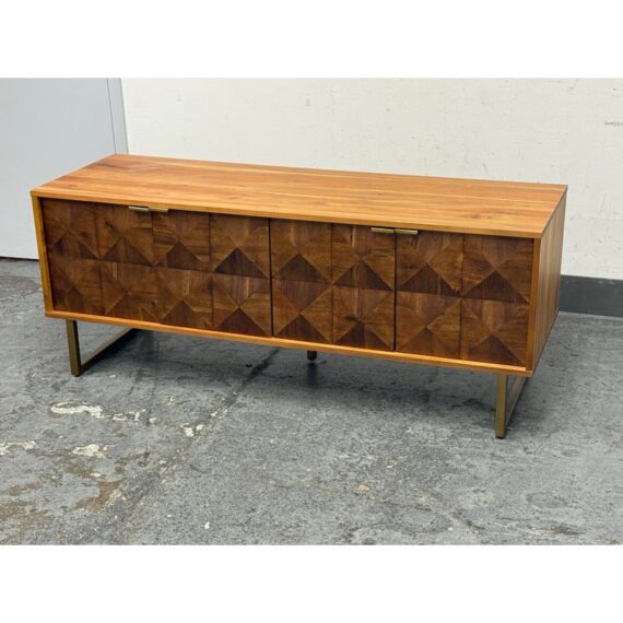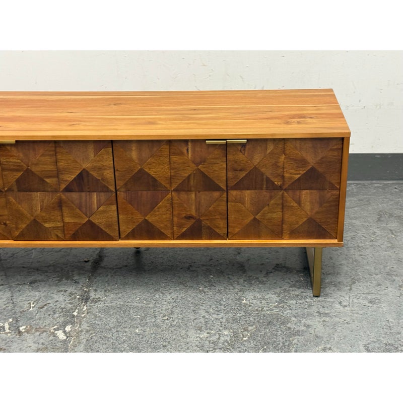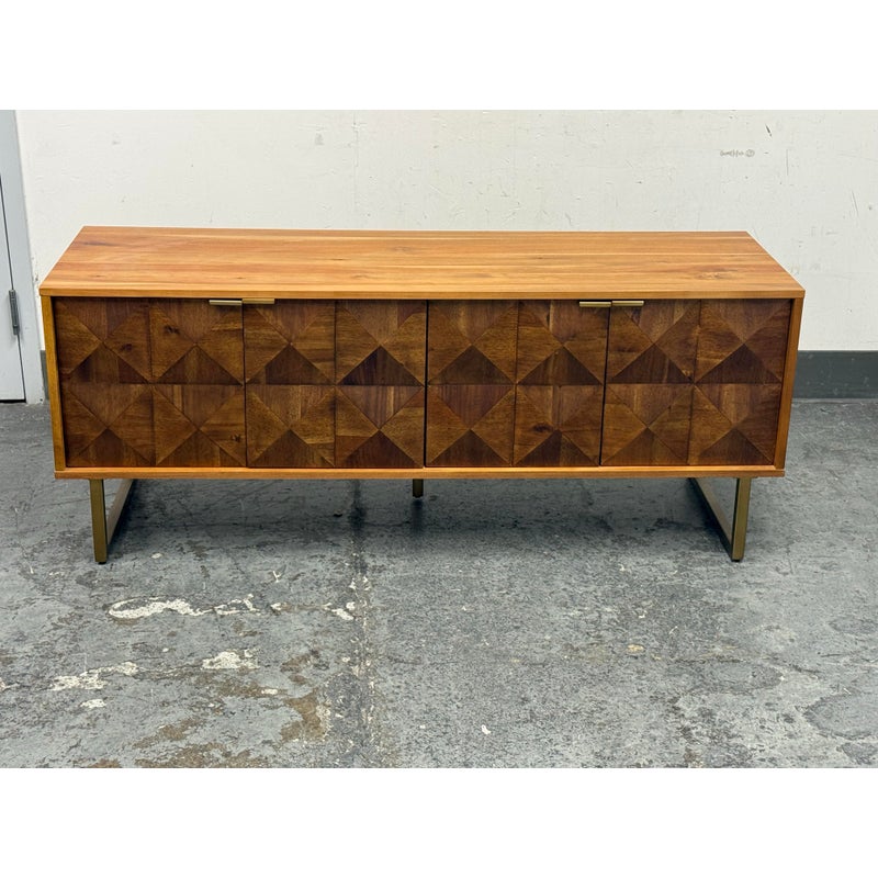 Design Plus Gallery presents the Diamond Rouvin Media Cabinet from World Market. The cabinet has four diamond-patterned doors to add dimensional + depth into your home with its two-toned and natural wood construction. This decorative entertainment unit has a smooth surface providing ample space for a large flat-screen television. There are two easily adjustable shelves behind doors with soft-closure mechanisms and a convenient cable management system, It standing on gold finish legs. In good condition, visible and minimal wear from usage.