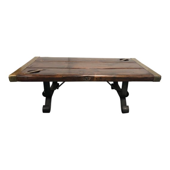 Design Plus Gallery presents a magnificent restoration of a World War II Liberty Ship Hatch Cover lovingly re-purposed into a finely finished coffee table with an iron twin pedestal base. Bronze hardware on the edges and corners of the table top are expertly installed. The ‘handle’ fixtures on opposite corners are recessed to remain flush with the table top. This custom coffee table is part of an American tradition in restoring the hatch covers from one of World War II’s most iconic and mass produced vessels used by both the US and her Allies. Originally a British design, the Liberty ships were copied and produced en mass by the US due to their low cost to manufacture. This restored historic piece sports rustic style and fine finish.