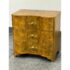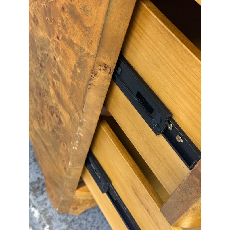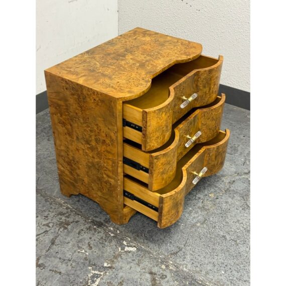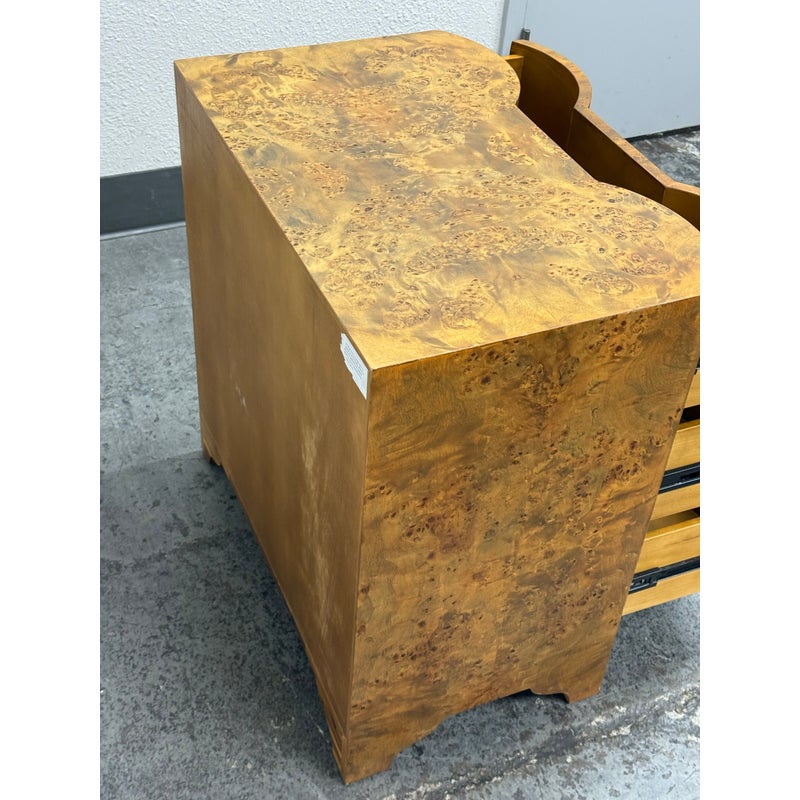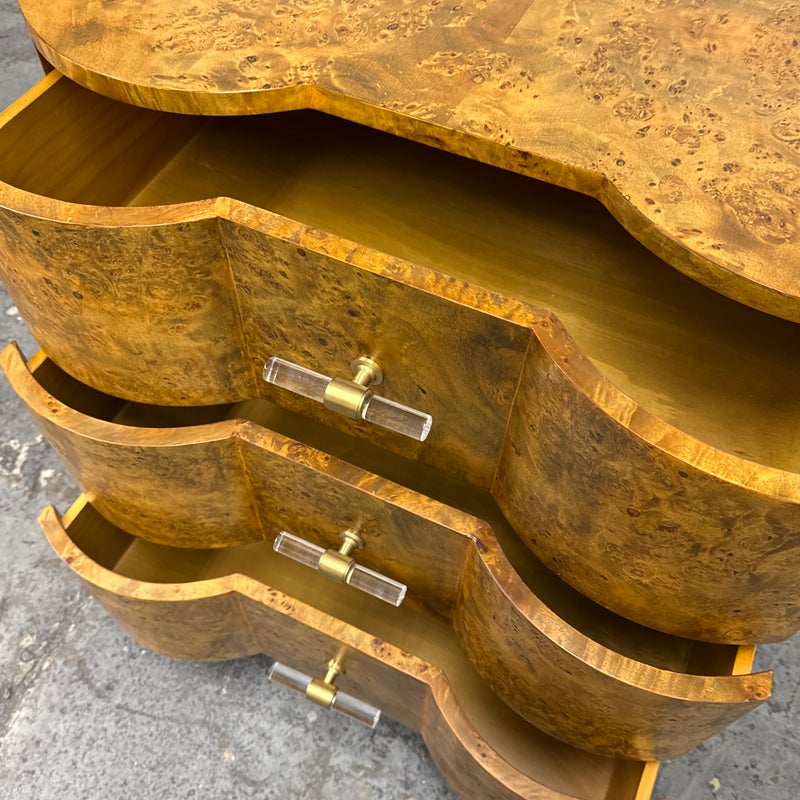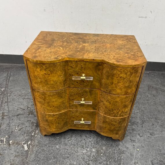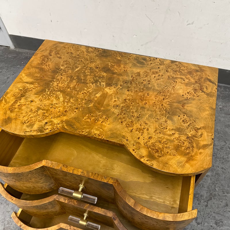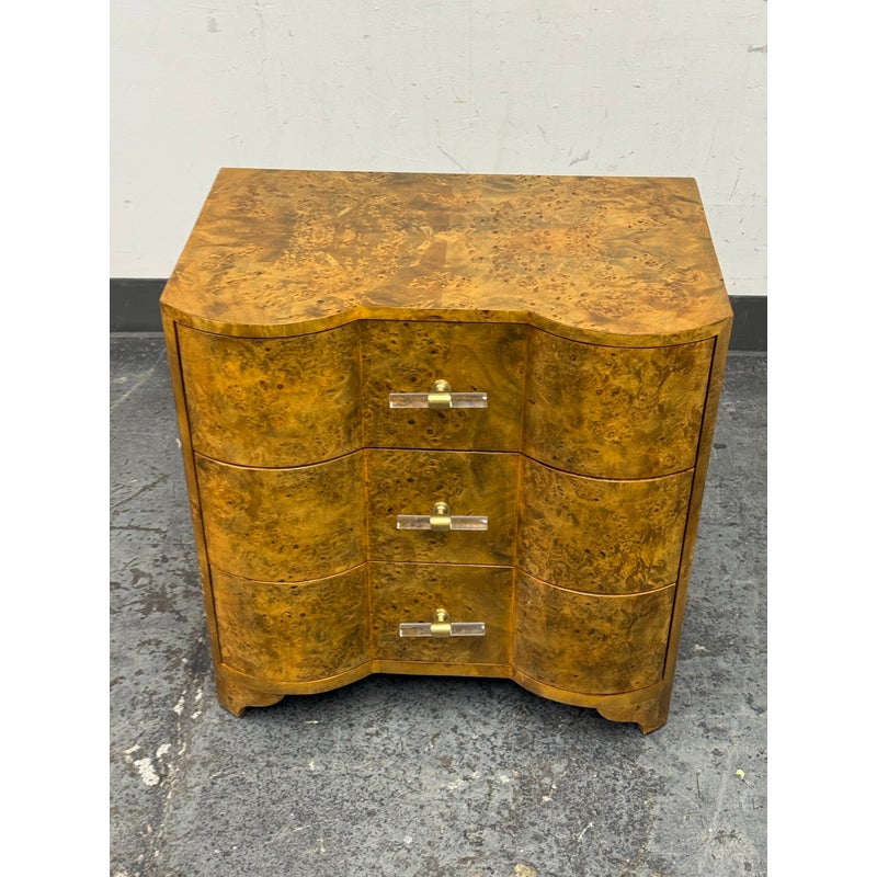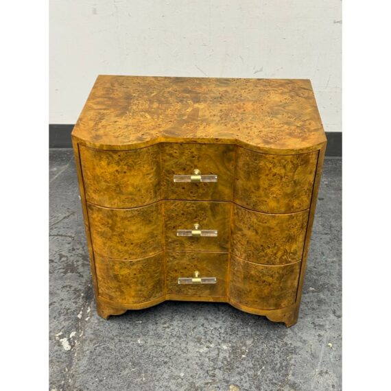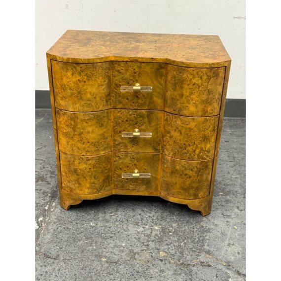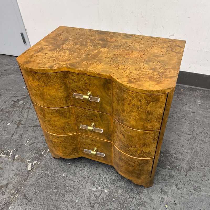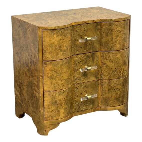 Design Plus Gallery presents the Calvin Side Table from Worlds Away. The table has a distinctive, serpentine profile that is dressed in exquisite, matte burl finish and accented with acrylic cylinder & brass hardware. Three generously sized drawers make Calvin an elegant storage solution for any interior. The three drawer side table is a modern heirloom in the making, reminiscent to mid 20th century designer Milo Brahmin creations. It is in good condition for its usage with minimal surface wear. Made in the USA.
