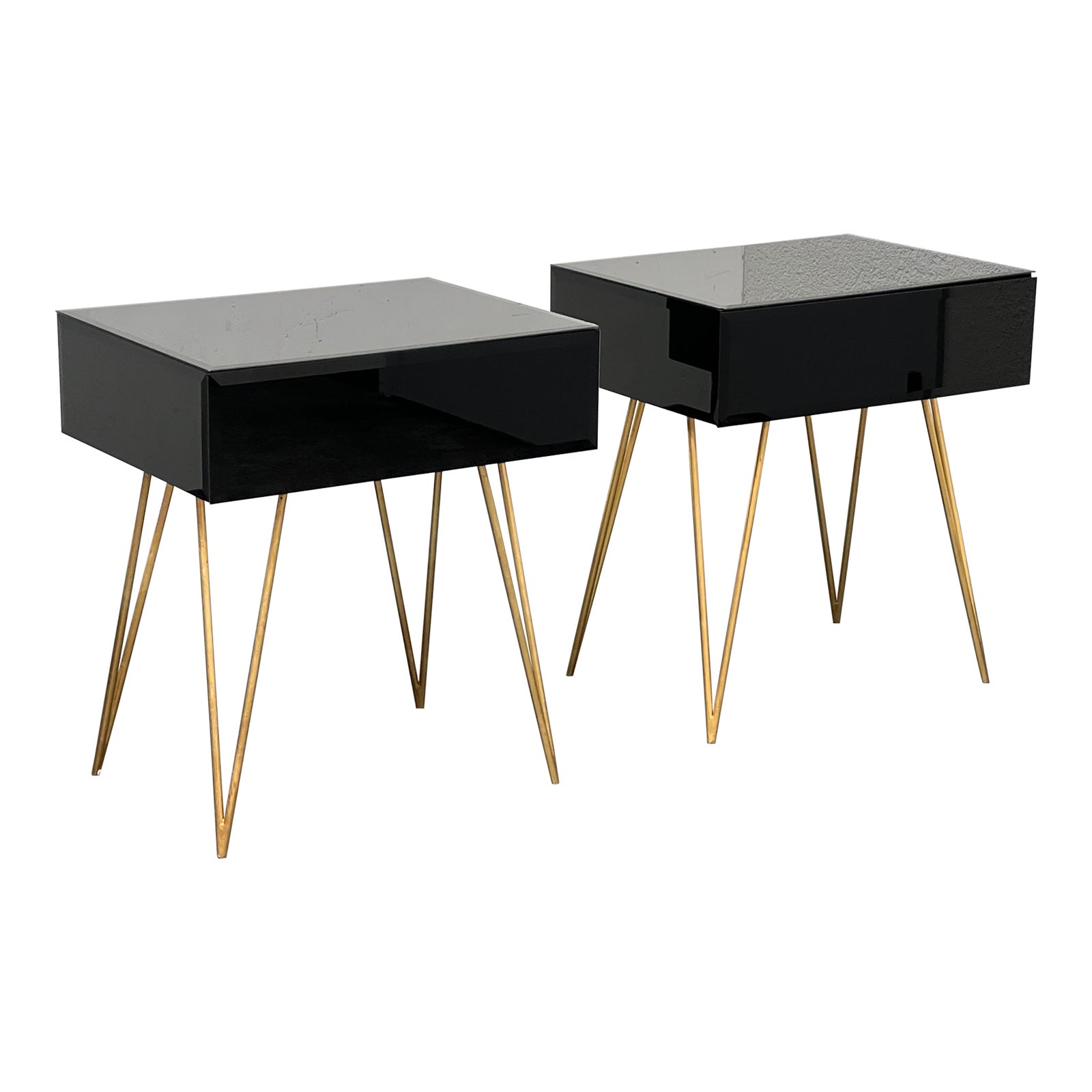 Design Plus Gallery presents a Pair of Black Glass Debra Nightstands by Worlds Away. One full size drawer apiece will make them not only good as side tables in living/family room but also as minimalistic night stands. Conditionally, you will spot chips to some of the edges. The legs are gold leafed hairpin legs. Visible and minor wear from usage.