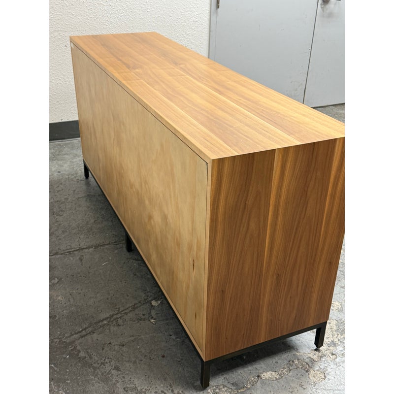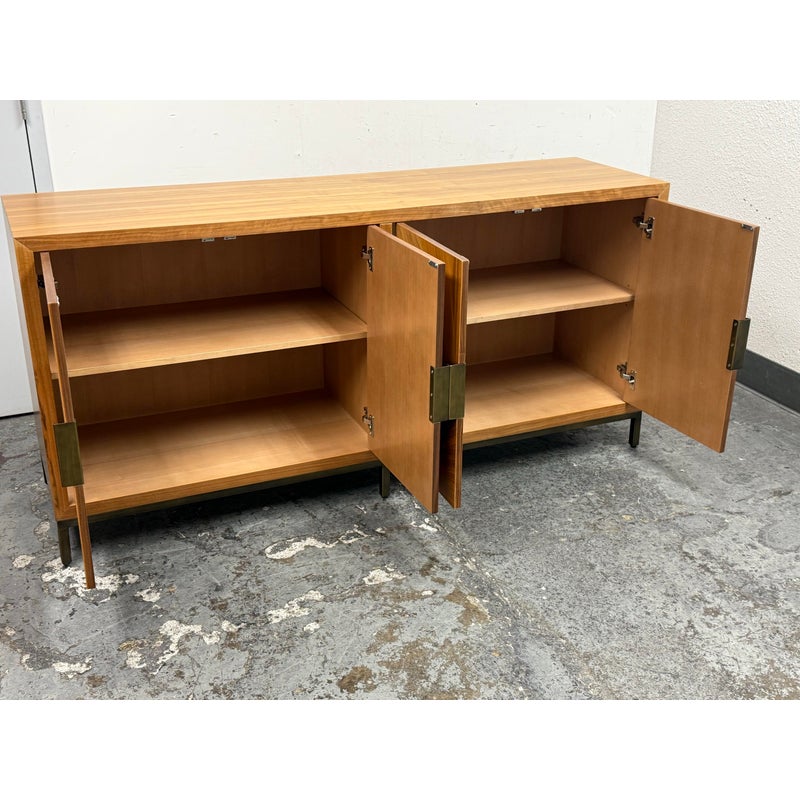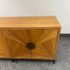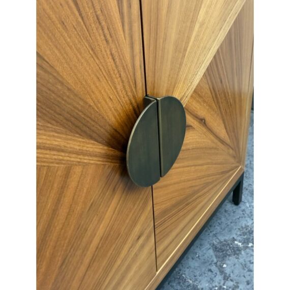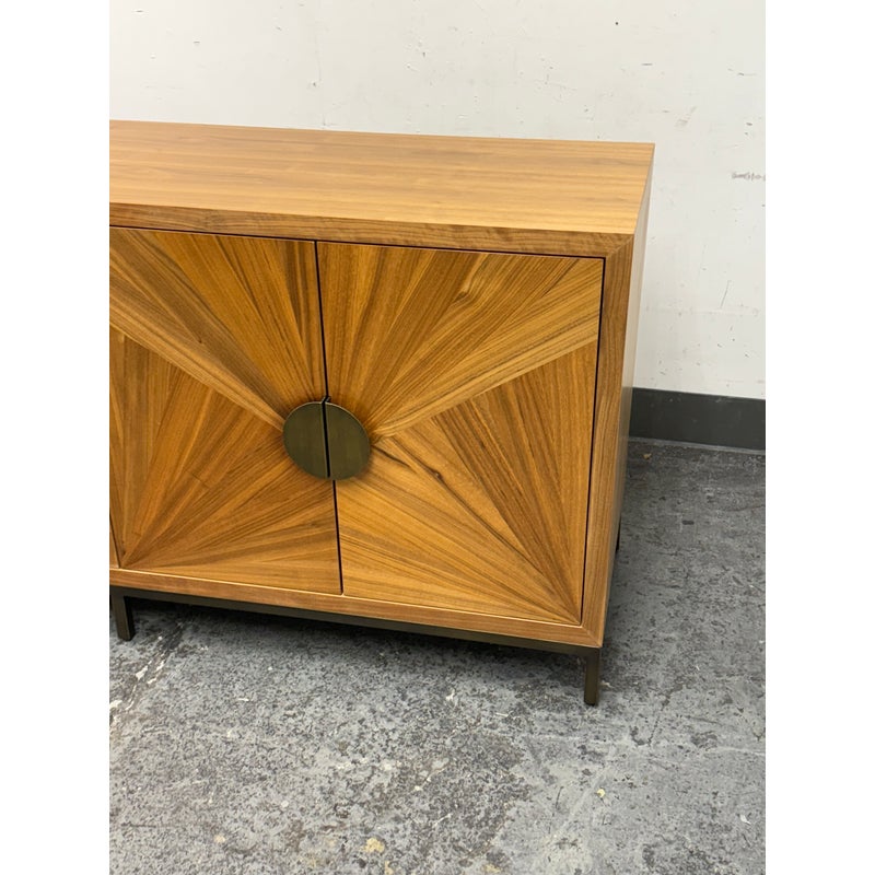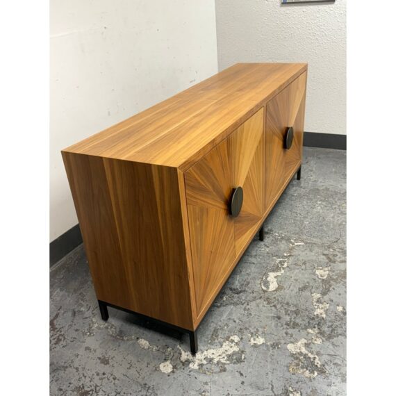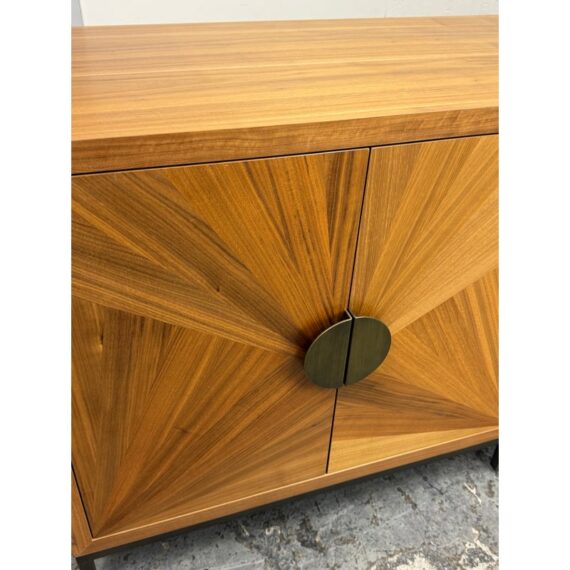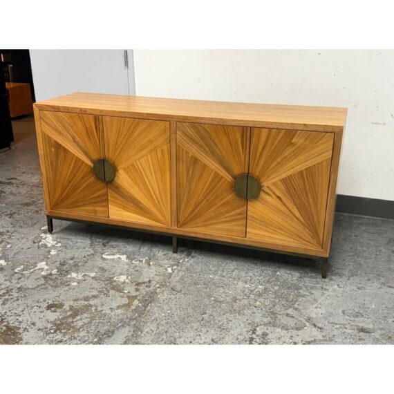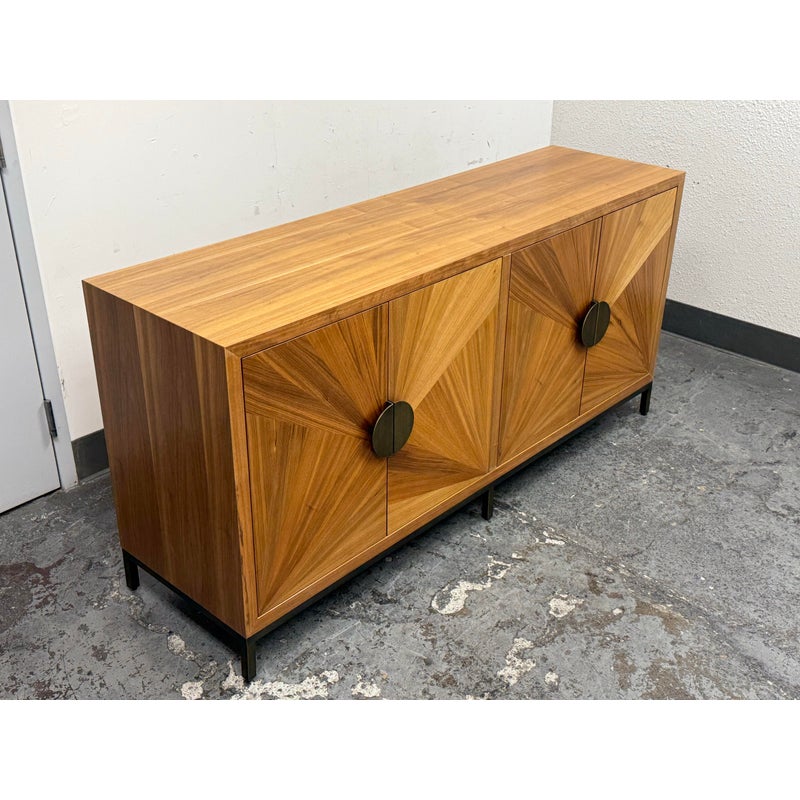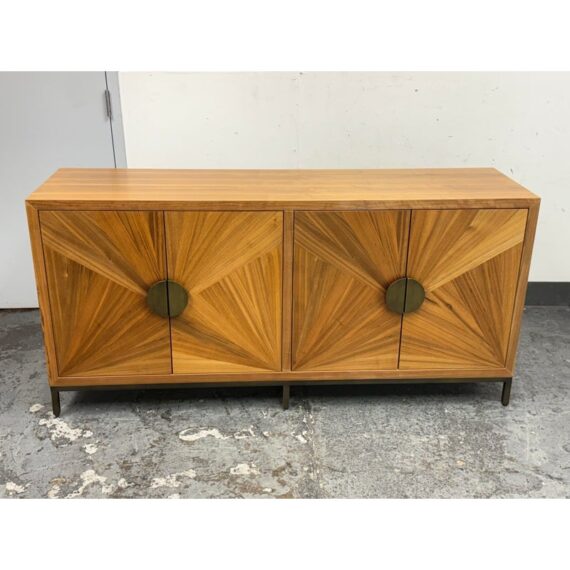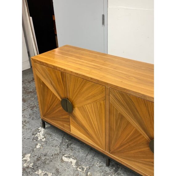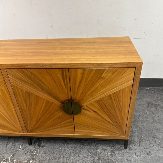 Design Plus Gallery presents an Emory Sideboard by Worlds Away. Superb styling and extraordinary detailing come together in this four door cabinet. A showstopper in any room with its distinctive radial walnut finish and painted bronze legs and hardware. In good condition, minimal wear from usage.