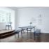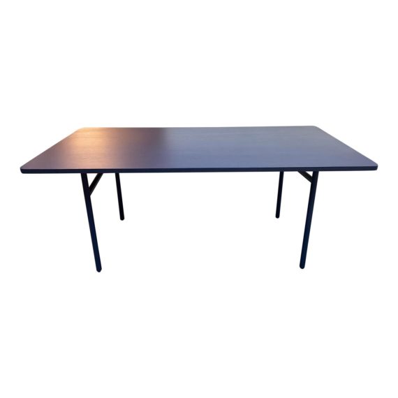 Design Plus Gallery presents a Diagonal Dining Table by Woud. This was a showcased item from a San Francisco Designer Showroom. Designed by Signe Hytte for Woud. The simple design with the apparent symmetry, the ends reveal a slightly diagonal leg support but together when seen from the end they form a perfect X, was inspired by scaffolding at building sites. The combination of light construction and dark materials create a graphic and minimalistic profile. The top is painted oak veneer, the base is powder coated metal. Minor wear on surface. The finish is a Navy Blue. Made in Denmark.