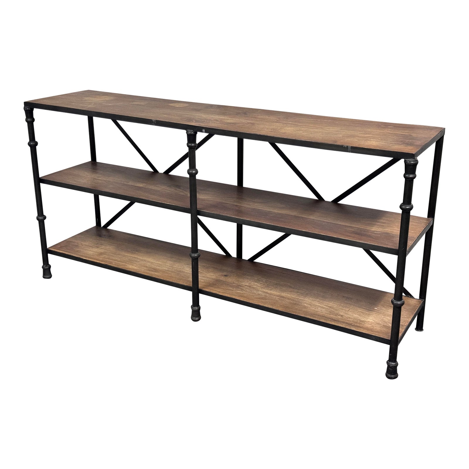 Design Plus Gallery presents a Rustic European Storage/Console from Wrightwood Furniture. The industrial piece has three long planks that are spaced apart to form shelves. The shelves are framed by cast iron work. The shelf does show some signs of age/wear but overall is in good condition.