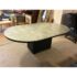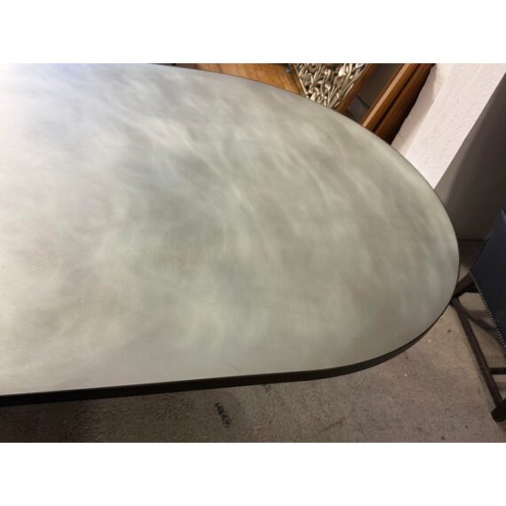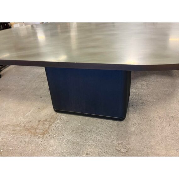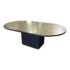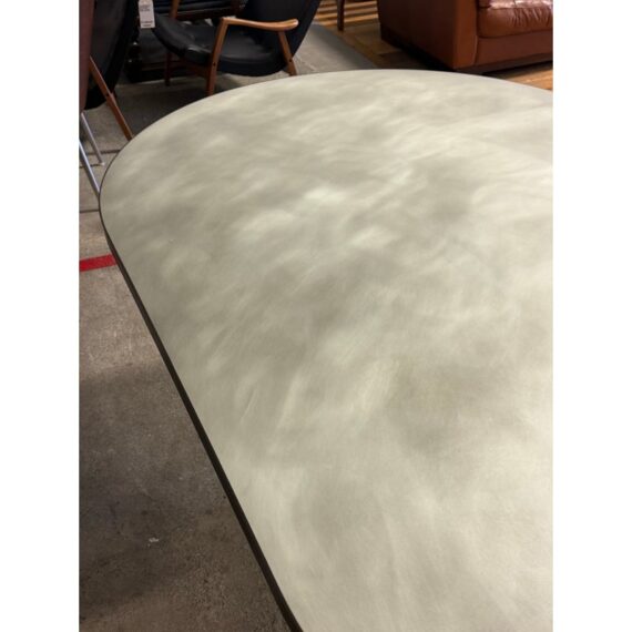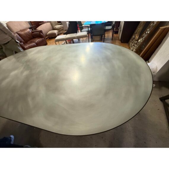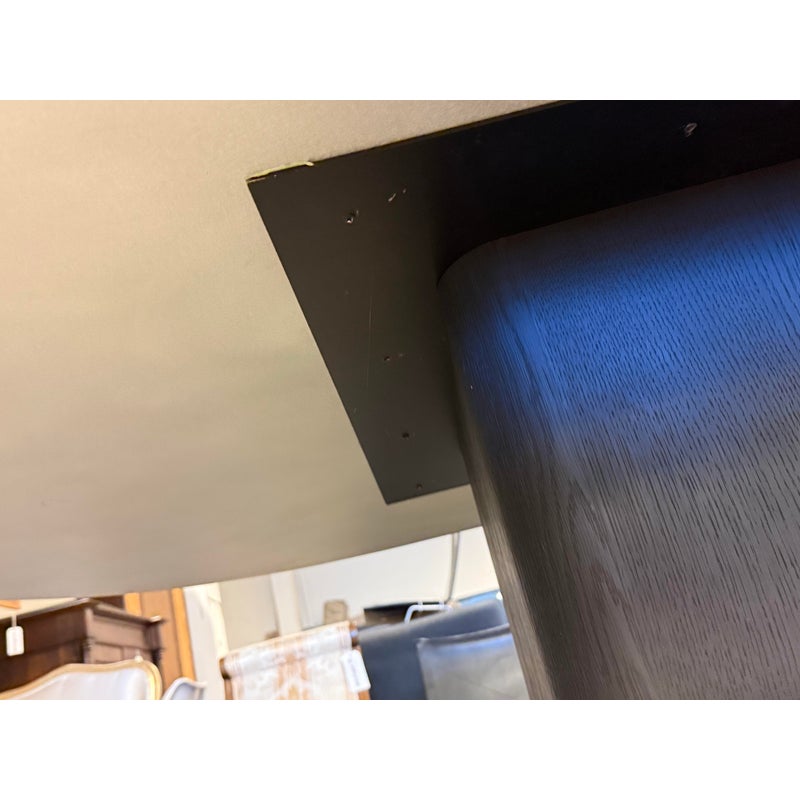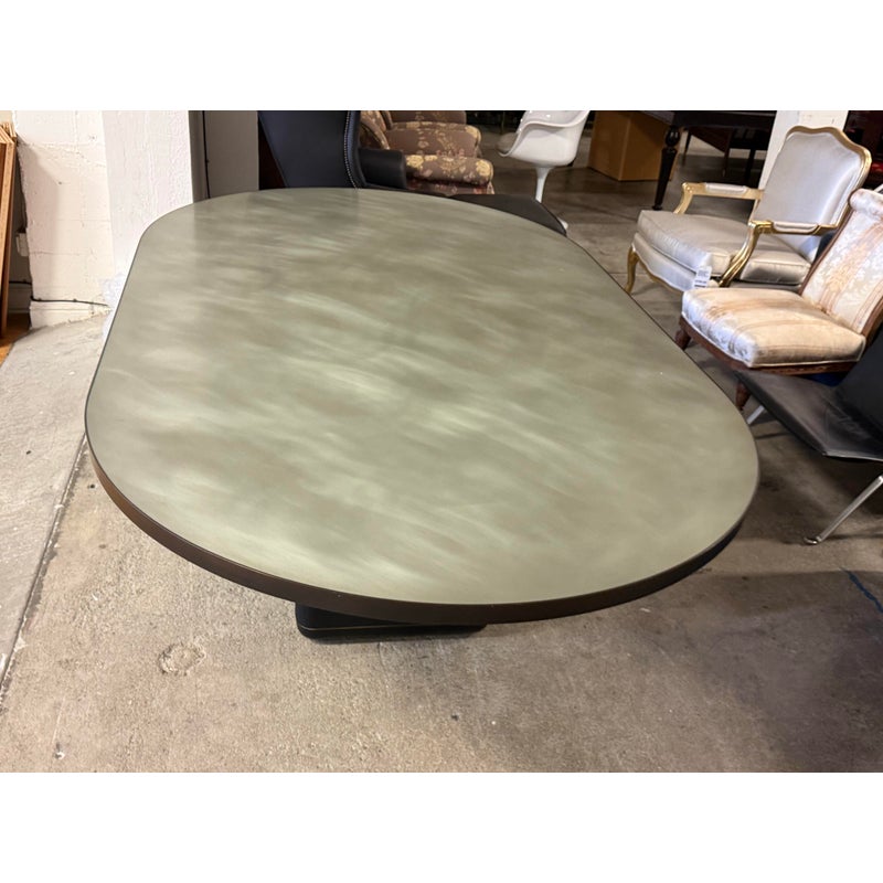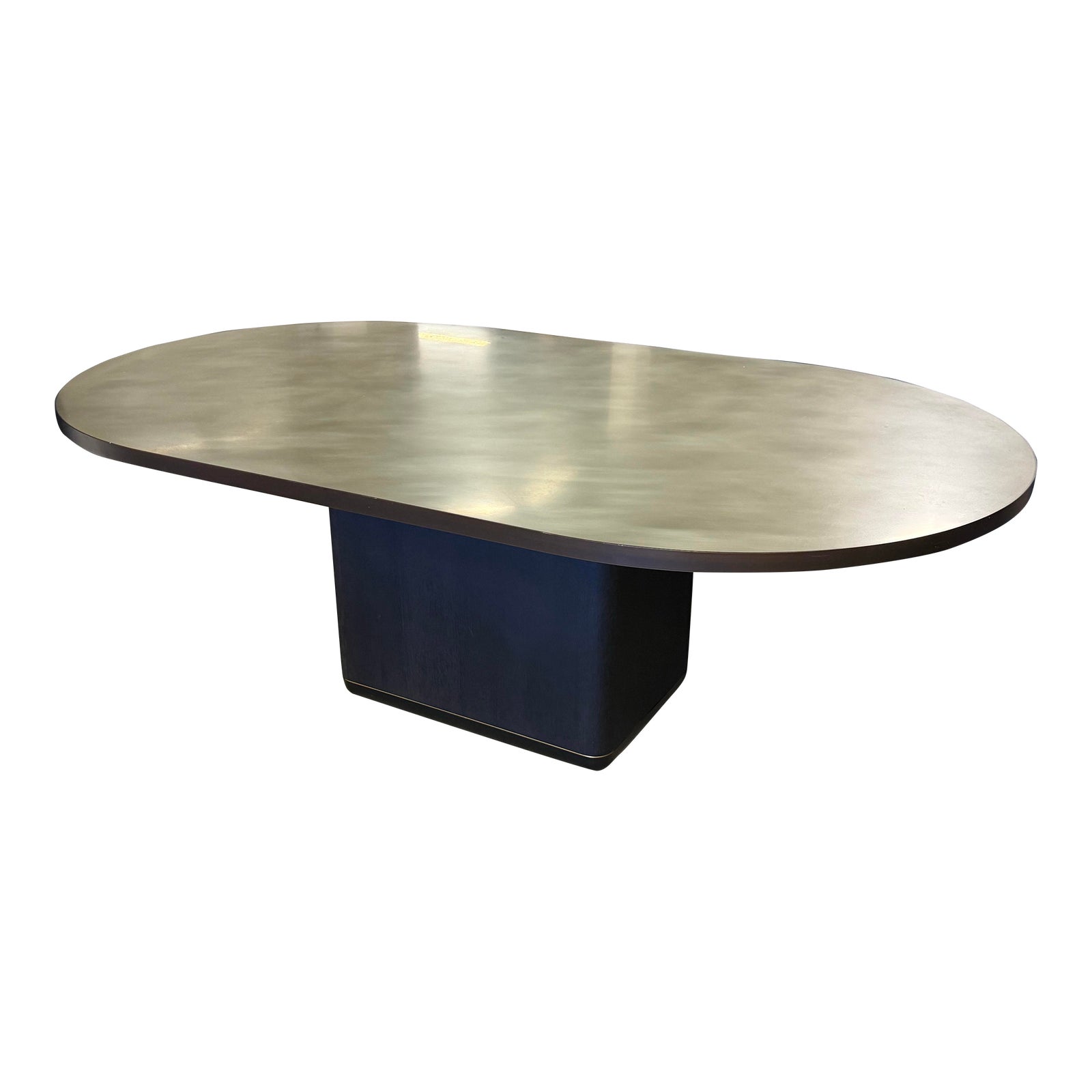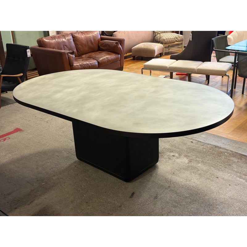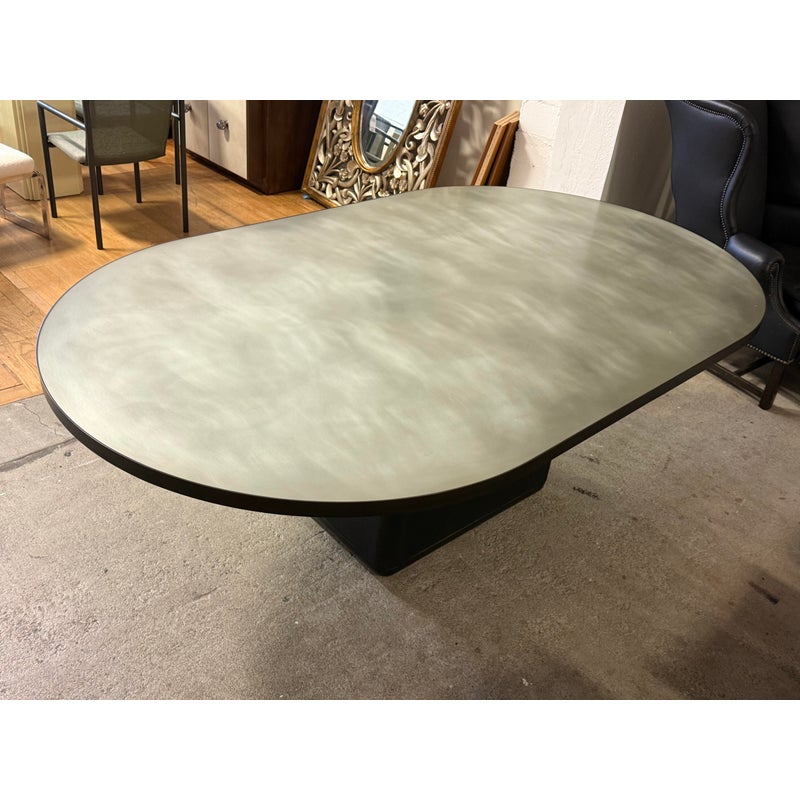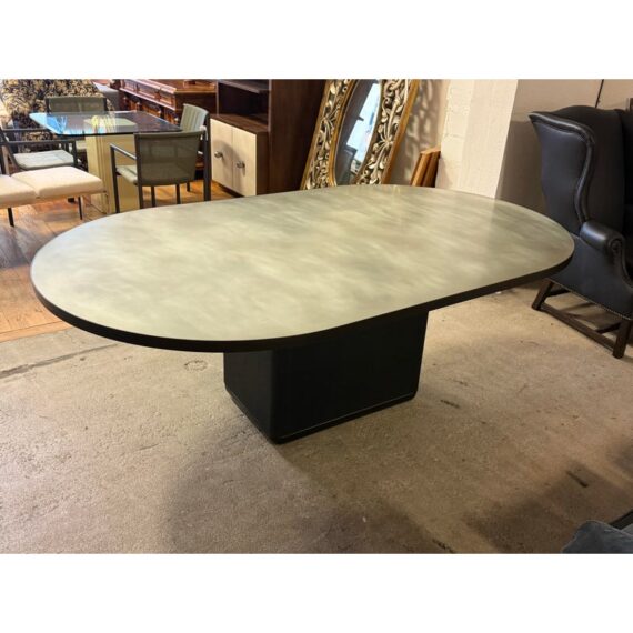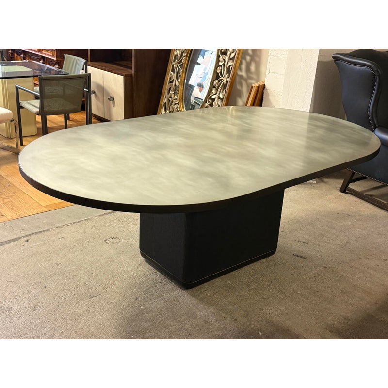 Design Plus Gallery presents a Custom Jasper Pedestal Dining Table from Wud Furniture. Commanding yet refined, the table pairs sculptural presence with everyday durability. A softly rounded, racetrack top with a light patina and subtly burnished finish brings a warm, timeworn glow, while the bold curved pedestal grounds the piece with architectural poise and generous legroom. The base combines charred black oak and blackened steel for depth and texture, a resin surface and edged with a whisper of bronze trim that catches the light and lifts the silhouette. Built to withstand daily life yet designed to make a statement, Jasper balances modern materiality with timeless craft—equally at home hosting family dinners or anchoring a dramatic dining room. In good condition, minimal wear from usage.