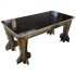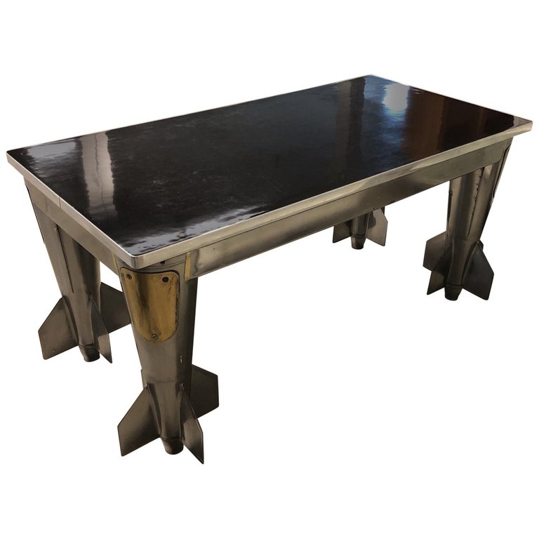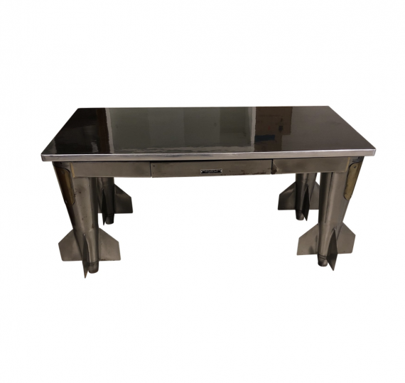 Design Plus Gallery presents a one of a kind desk. A unique rocket bomb desk, made of World War II rocket shells, welded to a 1960’s laboratory table by Fisher Scientific Company made in USA. Handcrafted by X21 Modern in 2002 , designed by John Conaty, a famous mid century collector who passed away in 2009. The work surface is highly polished reflective black. A single pullout drawer in the middle.