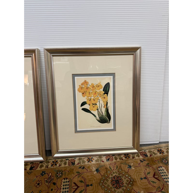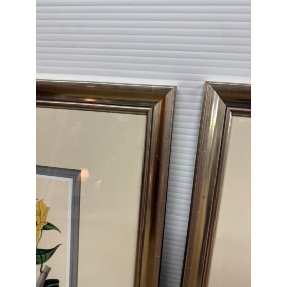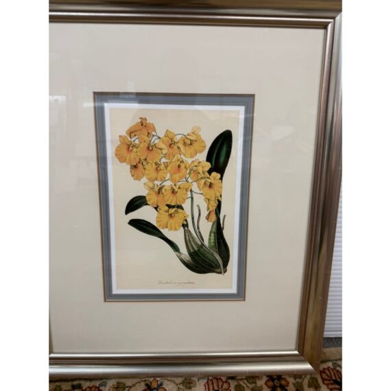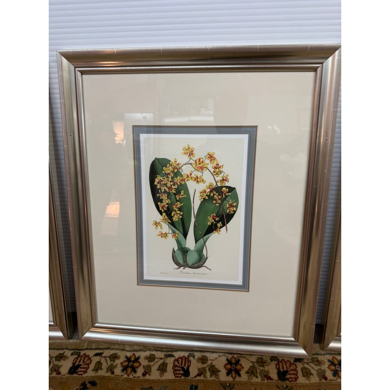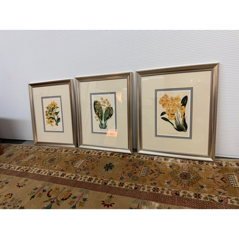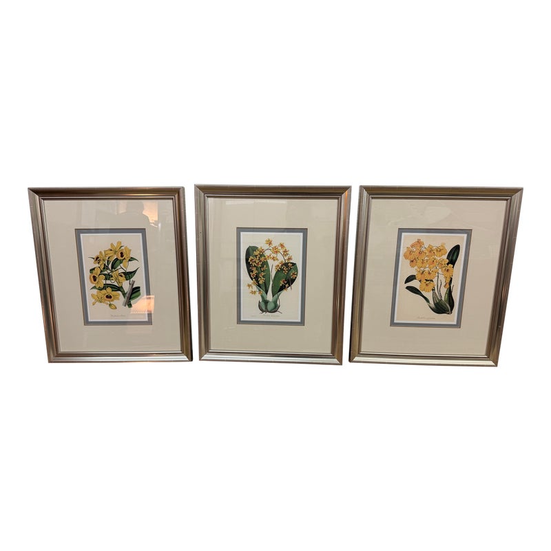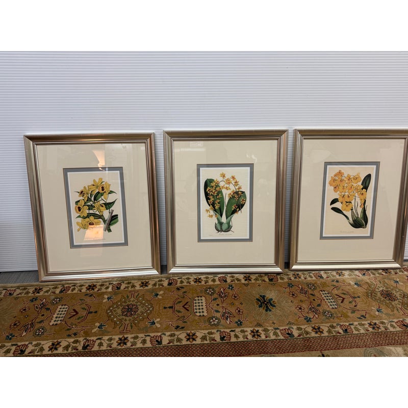 Design Plus Gallery presents a Set of Three Botanical Prints. Popular starting in the 18th century, prints of the like were used to identify and introduce species in the medical field. The set of three botanicals is of flowers that have a soft yellow coloring. They are all encased in a silver frame with wide white matte to amplify its imagery. They are all in good condition with identical measurements.