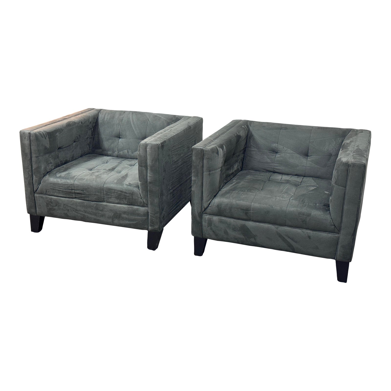 Design Plus Gallery presents a Pair of Benny Lounge Chairs from Z Gallerie. A set of deep seated contemporary chairs to unwind in. Track arms and button tufting give them an understated elegance. Made from microfiber in a smokey gray/green. The chairs are in good condition for their age + use.
