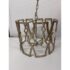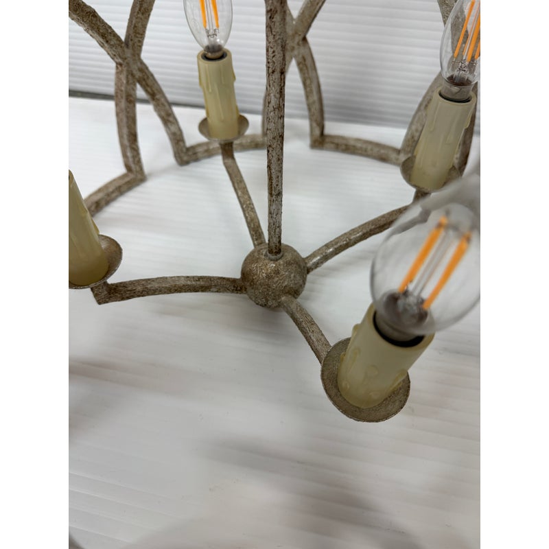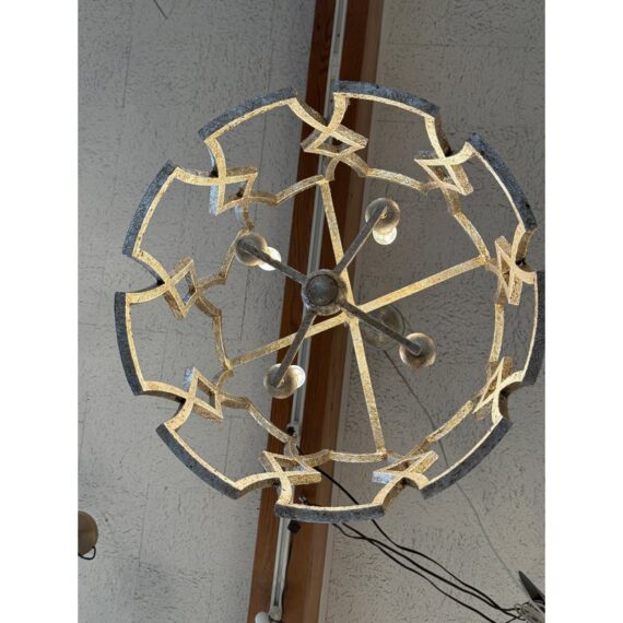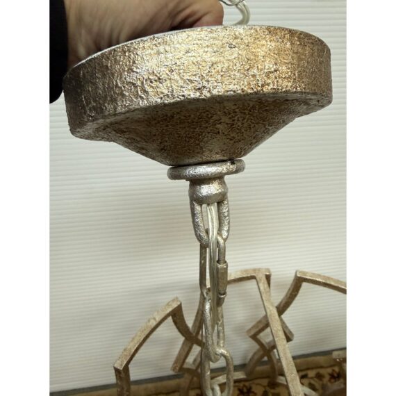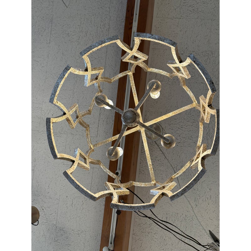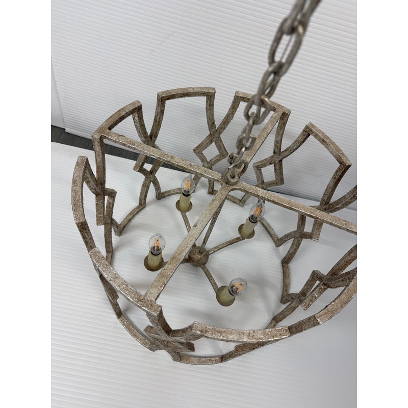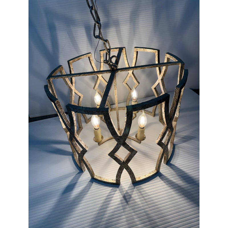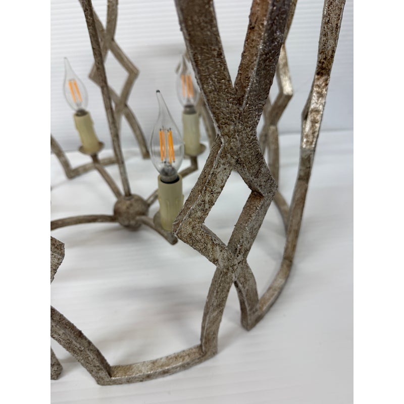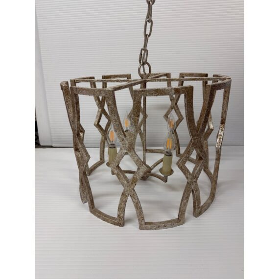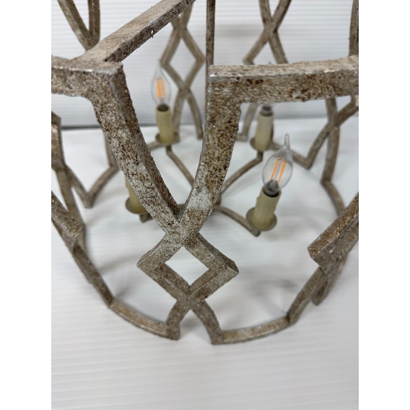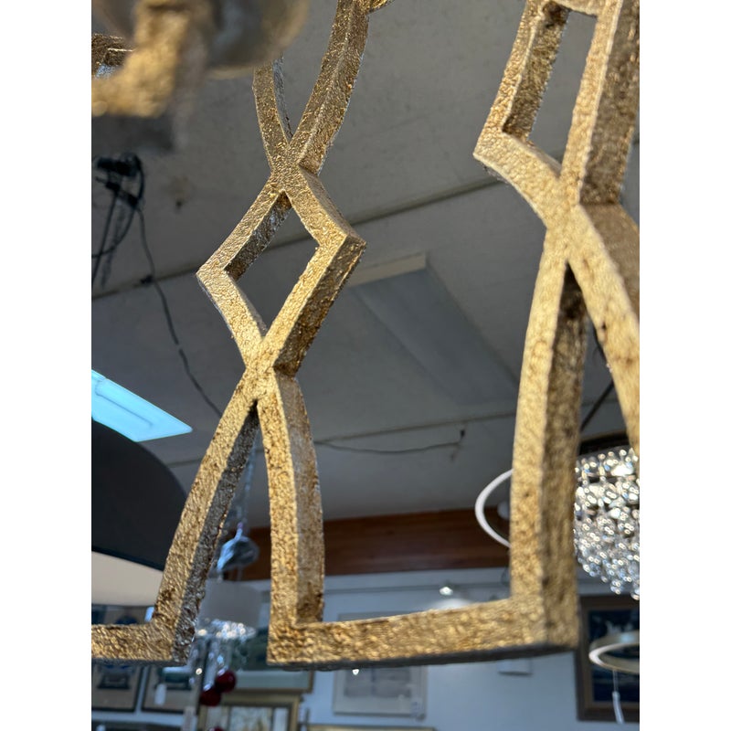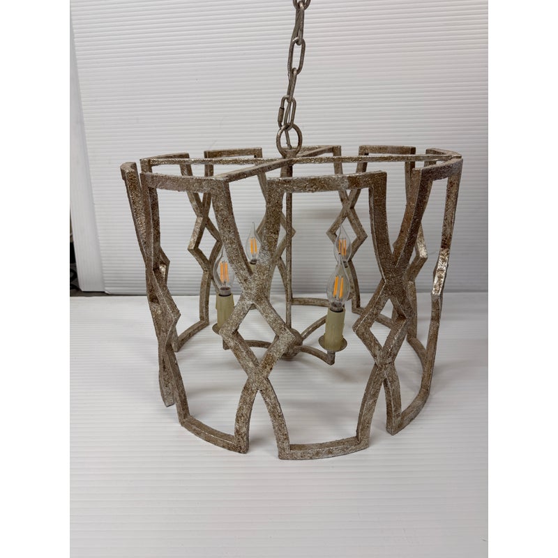 Design Plus Gallery presents a Four Light Chandelier from Z Gallerie. This chandelier has an openwork geometric metal frame in a champagne-toned surface with four interior candle-style lights suspended from a central armature. The angular silhouette and textured surface give the piece a sculptural presence, while the open design allows the form and illumination to remain fully visible. This is a discontinued model with the brand and is in good condition with visible and minimal wear from usage.