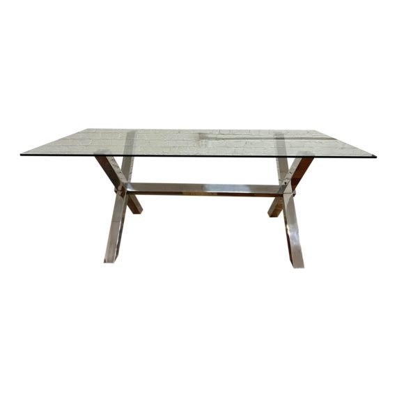Design Plus Gallery presents a Z Gallerie Polished Chrome Trestle Base + Glass Top Dining Table. Two X formations are trestle supported in a sleek and reflective polished chrome finish. Base supports the rectangular glass top for a modern look. Large table can easily double for a workspace and glass makes for easy cleaning and maintenance. Minor wear on surfaces, table is in good condition.