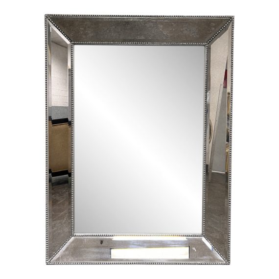 Design Plus Gallery presents a Rectangular Wall Mirror by Z Gallerie. A rectangular mirror with beveled edges is secured in a wood frame that’s finished in gray. On the frame’s front are four trapezoidal mirror panels that lean forward and are with beveled edges. Metallic dot accents run along all sides of the trapezoidal panels. A hanging cord is attached on the back for mounting purposes. Minor wear from use; mirror is in good condition.