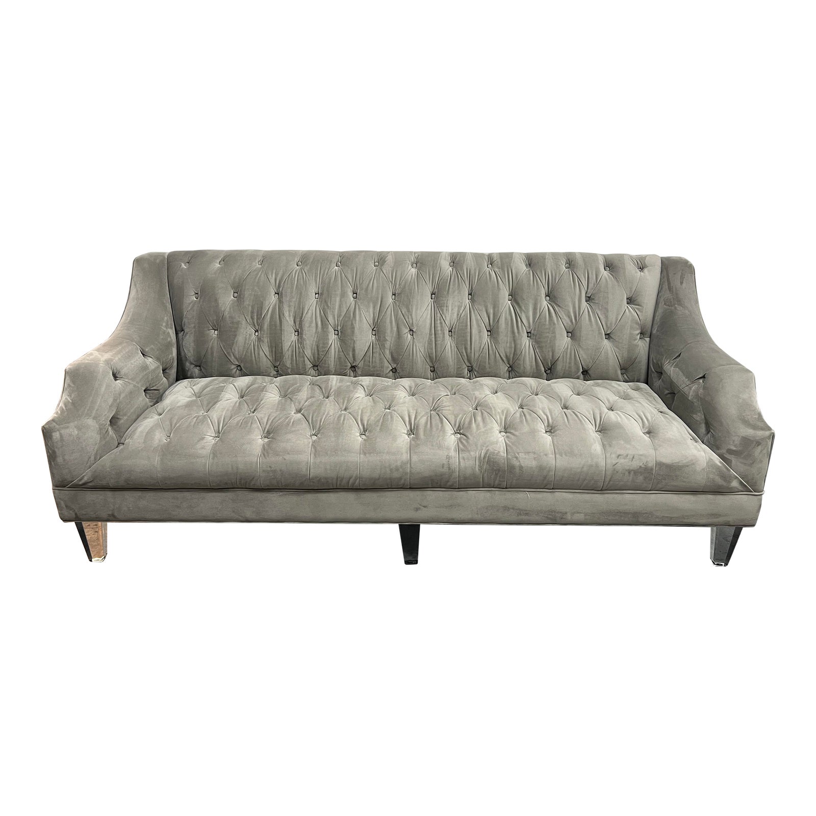 Design Plus Gallery presents a Simone Sofa by Z Gallerie. A diamond tufting and swooping frame, notched arms give this seating a timeless elegance. Acrylic legs anchor the look with modern flair. Features 8-way hand-tied spring suspension. Upholstered in Bella Dove. Minor wear from usage. Exclusive to Z Gallerie.