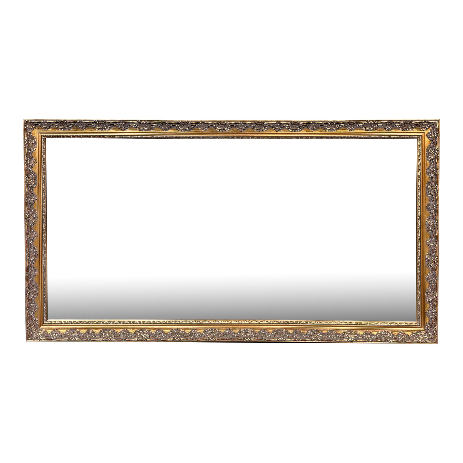 Design Plus Gallery presents a Vintage Style Gilt Framed Wall Mirror. Delicate carved details are embellished with rich gilt finish on this slim framed wall mirror. D-Ring fittings allow installation vertically or horizontally. Light surface wear; condition is fair for age and use.