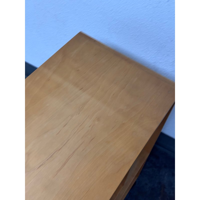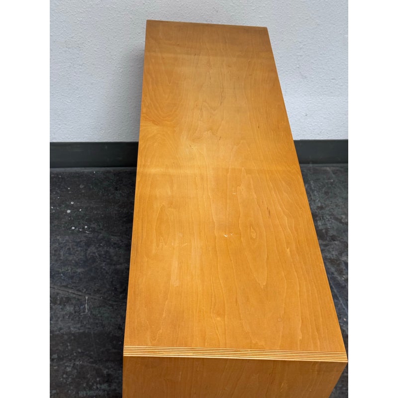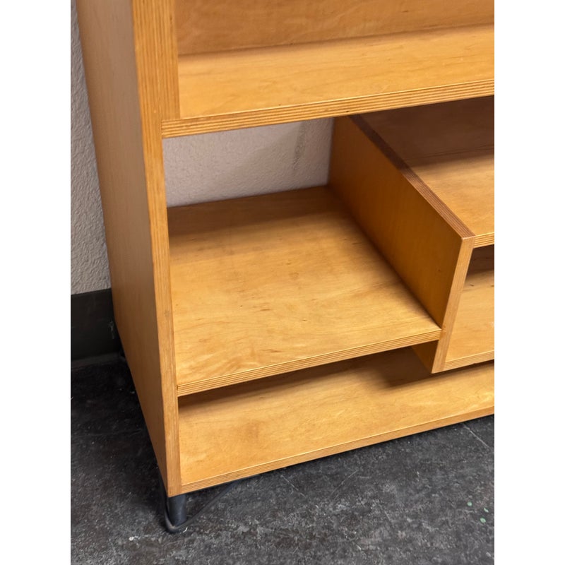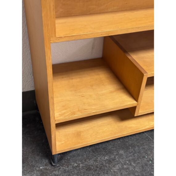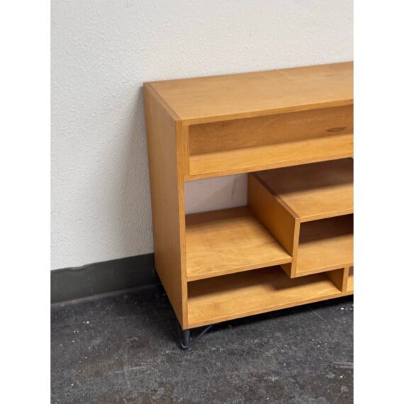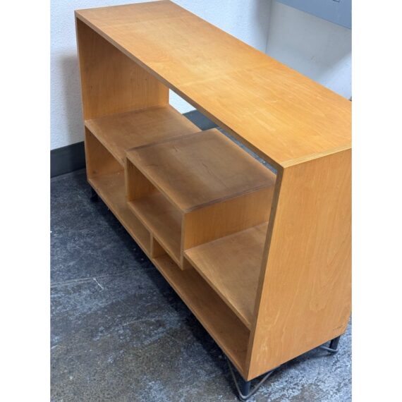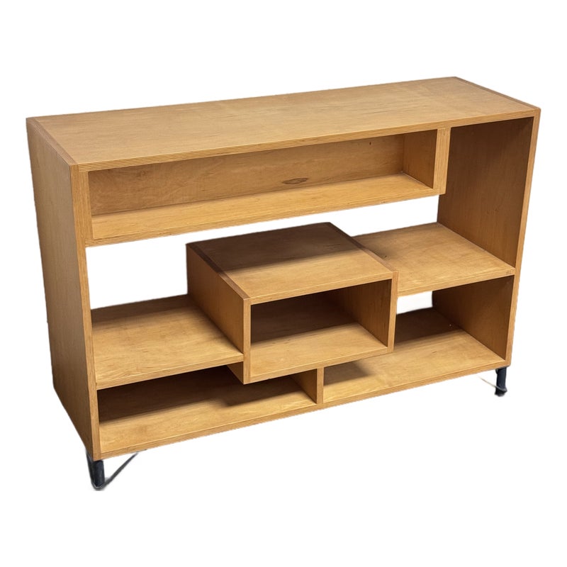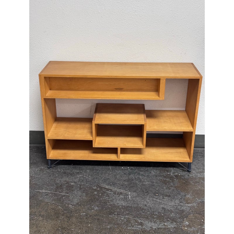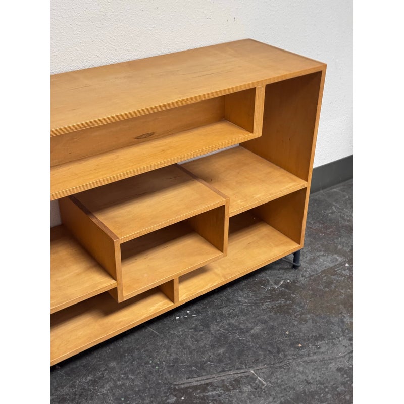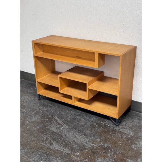 Design Plus Gallery presents a Geometric Shelving Unit from Zinc Furniture. The shelving unit was made with the use of light toned wood with visible wood grain, giving it a natural finish. Multiple shapes will transform your composition inside, with unique shapes to showcase your items du jour with style. The brand plate as well as a stamp AUF-TRAk is found a the base. Overall the piece is in good condition with minimal visible wear.